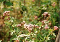フジバカマ(藤袴) 刈り取って半乾きにすると、桜餅のような甘いにおいがします。乾燥させたものを、入浴剤として使うと皮膚のかゆみに効くそうです。 |