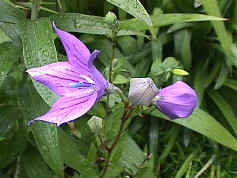 キキョウ(桔梗) その太い根が、韓国ではトラジと呼ばれ、漬物や料理にたくさん使われています。3年以上たった根は、漢方としてのどの痛みに効くそうです。 |